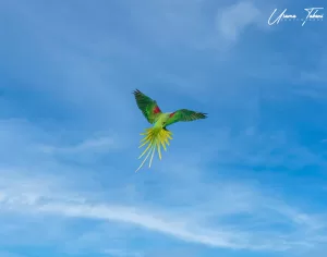 Alexandrine Parakeet (Psittacula eupatria) is a vibrant and majestic bird species native to South Asia, including Pakistan. It is one of the largest parakeet species, measuring around 58 to 62 centimeters (23 to 24 inches) in length. This parakeet is predominantly green, with a distinctive red patch on its shoulders, blue and yellow feathers on its wings, and a broad and elongated tail. Adult males typically exhibit a black ring around their necks, while females lack this feature. Their powerful bills are adapted for cracking seeds and nuts, which form a significant part of their diet.