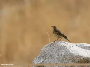 These pipits are highly active foragers, often seen walking or running on the ground while searching for insects, seeds, and other small invertebrates. They may also perch on rocks or fences to survey their surroundings. During migration, they form loose flocks, moving in search of suitable habitats and food sources.