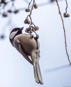 Cinereous Tits are social birds often seen in small flocks or family groups. They are highly active and agile, frequently hopping between branches and foliage in search of insects, seeds, and small fruits. Their diet primarily consists of insects during the breeding season and seeds during the winter months. They are known for their acrobatic foraging behavior, often hanging upside down or clinging to branches while searching for food. These birds are also known to visit bird feeders, particularly in urban and suburban areas. During the breeding season, they construct nests in tree holes or nest boxes, lining them with soft materials such as moss, feathers, and fur.