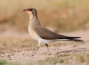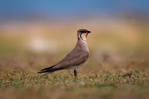 The Collared Pratincole (Glareola pratincola) is a migratory bird found in Pakistan during its wintering season. With distinctive brown and white plumage, it is often observed in open grasslands, marshes, and wetlands across the country.