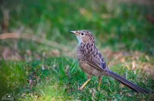 The Common Babbler (Turdoides caudata), also known as Jungle Babbler or Seven Sisters, is a small bird found across Pakistan. It has a distinctive appearance, with a brownish-grey plumage, a long tail, and a prominent white throat patch. They typically move in groups, foraging for insects and small fruits in dense vegetation, emitting a series of loud and melodious calls.