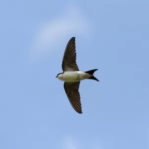 Common House-Martin (Delichon urbicum) is a small passerine bird belonging to the swallow family. With its distinctive glossy blue-black plumage and white underparts, it is easily recognizable. Its streamlined body and forked tail aid in swift flight, and it often nests in colonies under eaves or on cliffs.