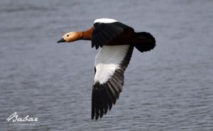 The common shelduck (Tadorna tadorna) is a waterfowl species of the shelduck genus, Tadorna. It is widespread and common in Eurasia, mainly breeding in temperate and wintering in subtropical regions; in winter, it can also be found in the Maghreb. Its scientific name comes from the French name Tadorne for this species. It may originally derive from Celtic roots meaning "pied waterfowl", essentially the same as the English "shelduck". It is a striking bird, with a reddish-pink bill, pink feet, a white body with chestnut patches and a black belly, and a dark green head and neck. The wing coverts are white, the primary remiges black, and the secondaries green (only showing in flight) and chestnut. The underwings are almost entirely white. Sexes are similar, but the female is smaller, with some white facial markings, while the male is particularly crisply colored in the breeding season, his bill bright red and bearing a prominent knob at the forehead. In Pakistan, small numbers winter in remote brackish wetlands around the border of Badin District and along the sea coast near Karachi. Occasional small flocks occur in the Salt Range Lakes, Head Marala and Balochistan. It is a striking bird, with a reddish-pink bill, pink feet, a white body with chestnut patches and a black belly, and a dark green head and neck. The wing coverts are white, the primary remiges black, and the secondaries green (only showing in flight) and chestnut. The underwings are almost entirely white. Sexes are similar, but the female is smaller, with some white facial markings, while the male is particularly crisply coloured in the breeding season, his bill bright red and bearing a prominent knob at the forehead.