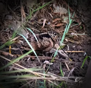 The Eurasian Woodcock is a medium-sized wading bird with cryptic plumage, characterized by intricate patterns of brown, buff, and black. It has a long, straight bill that it uses to probe the ground for invertebrates, its primary food source. Its large, dark eyes are situated high on its head, aiding in its nocturnal foraging habits. Despite its size, it is well-camouflaged against the forest floor, making it difficult to spot.