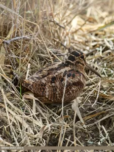 The Eurasian Woodcock is a primarily nocturnal bird, spending the daylight hours concealed in dense vegetation or roosting in thickets. At dusk, it becomes active, using its long bill to probe the soil for earthworms, insects, and larvae. It is known for its distinctive display flights during the breeding season, where males spiral upward into the sky, producing a series of whistling and chirping sounds with their wings. In Pakistan, they are often observed in moist woodlands, marshes, and along watercourses where suitable habitat and food sources are available.