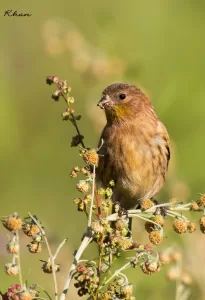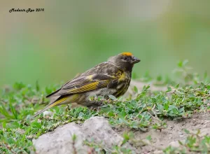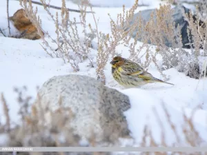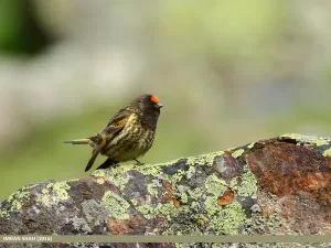 This bird species is known for its agile and acrobatic flight, often seen flitting between rocks and perching on exposed branches. Fire-fronted Serins are predominantly seed-eaters, feeding on various grass seeds, buds, and occasionally insects. They are generally social birds, often found in small flocks during the non-breeding season, but they may pair up during the breeding season.