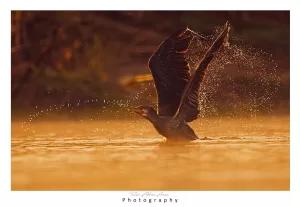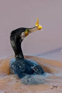 Great Cormorants are highly skilled divers and feed primarily on fish, although they may also consume crustaceans and other aquatic organisms. They are often seen swimming low in the water, with only their long necks and heads visible. After fishing, they frequently perch on rocks, branches, or other elevated structures to dry their wings, as their plumage is not entirely waterproof. These birds are social and often gather in large flocks, especially during the non-breeding season. During the breeding season, they form colonies on coastal cliffs, islands, or trees near water bodies, where they construct nests out of sticks and other materials.