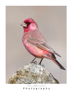 The Great Rosefinch (Carpodacus rubicilla) is a medium-sized bird known for its vibrant plumage, with males displaying bright pinkish-red feathers on their head, breast, and back, while females have duller plumage. They have a stout bill and a distinctive white wing patch.