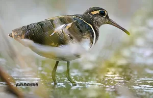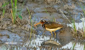 The Greater Painted-Snipe (Rostratula benghalensis) is a striking bird found in Pakistan, particularly in wetlands and marshy areas across the country. This species exhibits sexual dimorphism, with the female being more colorful than the male, contrary to typical bird behavior.