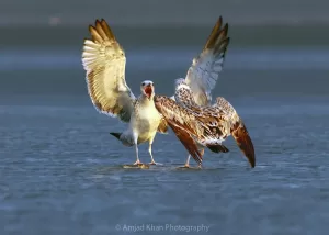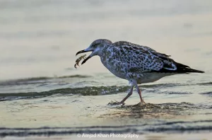 Heuglin’s Gull (Larus heuglini) in Pakistan typically exhibits opportunistic feeding behavior, scavenging along coastal areas, estuaries, and wetlands for fish, crustaceans, and invertebrates. They may also feed on human refuse in urban areas. During the winter months, they form mixed flocks with other gull species along the shores of the Arabian Sea, contributing to the avian diversity of Pakistan’s coastal regions.