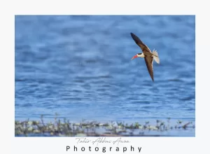 The Indian Skimmer is a distinctive bird with a striking appearance characterized by its unique bill, which is long, laterally compressed, and has a lower mandible longer than the upper one. Its upperparts are predominantly black, while the underparts are white, with a distinctive black collar around the neck. During flight, its wings display a black trailing edge contrasting with white primary feathers. They have a short tail and long, pointed wings.