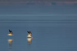 Indian Skimmers are highly specialized feeders, using their unique bill to skim the water surface while flying low over rivers and lakes. They primarily feed on small fish, insects, and crustaceans, which they catch by flying with their lower mandible dipped into the water, slicing through the surface when they detect prey. They are typically observed foraging in small groups, often cooperatively herding fish into shallow areas before skimming.