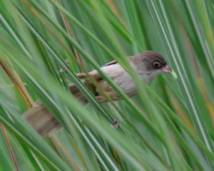 Jerdon's Babbler (Chrysomma altirostre) is a small bird species found in Pakistan, particularly in the scrub and thorn forests of Sindh and Punjab provinces. It has a distinctive appearance with its brown plumage and white markings on the throat and belly. These birds are known for their secretive behavior, often staying hidden within dense vegetation. They are primarily insectivorous, foraging on the forest floor for small insects and larvae.