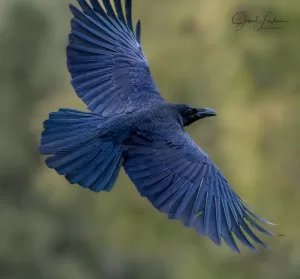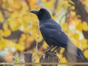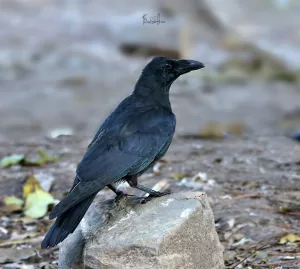 Large-billed Crow (Corvus macrorhynchos) is a robust and distinctive bird species found in Pakistan. It is characterized by its large size, glossy black plumage, and notably thick and sturdy bill. Adults typically measure around 48 to 52 centimeters in length. Its vocalizations consist of a variety of loud caws and calls, often heard as it moves through its environment in search of food.