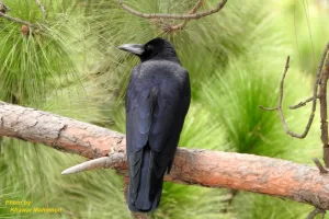 Large-billed Crow is an opportunistic omnivore, feeding on a diverse diet that includes insects, small vertebrates, fruits, seeds, and carrion. They are highly intelligent and resourceful birds, known for their problem-solving abilities and complex social behaviors. Large-billed Crows often form large communal roosts, particularly during the non-breeding season, where they gather in large numbers to sleep and socialize. They are also known to exhibit playful behaviors, engaging in aerial acrobatics and chasing each other in mid-air. During the breeding season, pairs of Large-billed Crows construct bulky nests made of twigs and branches, usually located high up in trees. Both parents take part in incubating the eggs and raising the chicks, demonstrating cooperative breeding behavior. Overall, the Large-billed Crow is a conspicuous and adaptable bird species in Pakistan, playing a significant ecological role as a scavenger and seed disperser while also displaying fascinating social and behavioral traits.