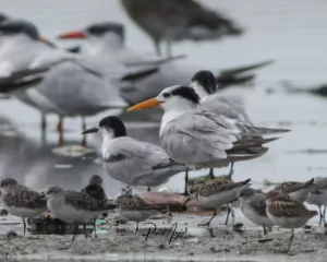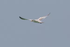 Lesser Crested Terns are highly migratory birds, breeding in colonies on coastal islands or remote beaches, often in association with other seabird species. They are agile fliers and skilled hunters, diving into the water from flight to catch fish, which they grasp with their bill. Outside of the breeding season, they may form large feeding flocks, particularly in areas with abundant fish populations.