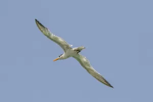 The Lesser Crested Tern is a medium-sized seabird with a distinctive appearance. It features a black cap extending from the bill to the nape, contrasting sharply with its white forehead and underparts. During the breeding season, adults develop a black crest on the back of the head, which contributes to their name. Their bill is orange-yellow with a black tip, and their legs are also orange-yellow. Juveniles lack the distinct crest and have a more mottled appearance.