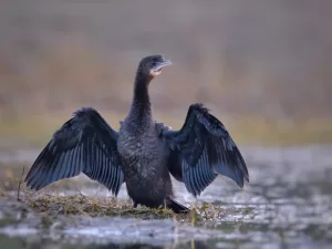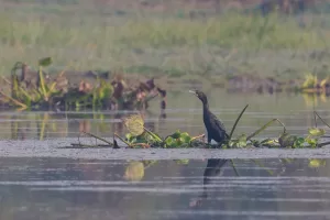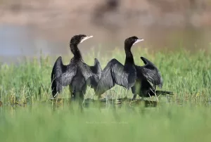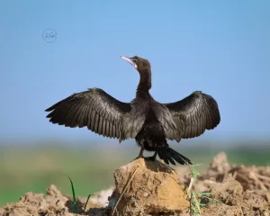 Little Cormorants are skilled divers and primarily feed on fish, crustaceans, and other aquatic prey. They often hunt in groups, diving underwater to catch their prey using their agile and streamlined bodies. After fishing, they can be seen perching on branches or rocks with their wings spread open, drying their feathers in the sun. They are generally social birds, often seen roosting and nesting in colonies, especially during the breeding season. Their nests are typically built in trees, bushes, or reed beds near water bodies.