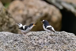 Little Forktails are agile and active birds, often seen hopping along rocks and perching on overhanging branches near water bodies. They feed on insects, larvae, and small aquatic invertebrates, which they forage for in and around the water. These birds are known for their shy and elusive nature, making them challenging to observe closely in the wild.