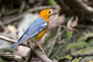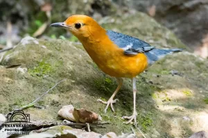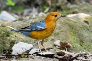 The Orange-headed Thrush (Geokichla citrina) is a medium-sized bird with a distinctive orange head, blackish wings, and a yellowish-orange underbelly. It has a melodious song and is known for its shy and elusive nature.