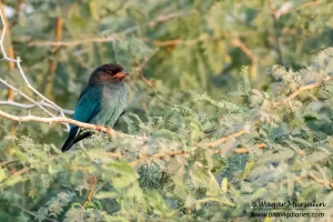 Oriental Dollarbird (Eurystomus orientalis), also known as the "Taka Chor" in Pakistan, is a striking bird characterized by its vibrant plumage and distinctive shape. With its iridescent blue-green back, bold black facial markings, and vibrant chestnut underparts, it stands out prominently in its habitat. Its name originates from the distinctive circular patterns on its wings, resembling silver dollars.