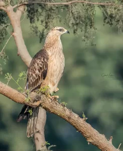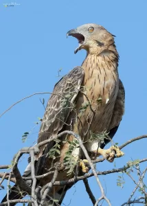 Oriental Honey-buzzard displays typical behaviors observed across its range in Asia. During migration, these birds can be spotted soaring gracefully in the skies, utilizing thermals to gain altitude effortlessly. Their diet primarily consists of larvae of social bees and wasps, although they also consume other insects, small mammals, and fruits. Oriental Honey-buzzards are solitary during much of the year, but may gather in loose groups during migration. They build their nests in trees within wooded areas, where they breed during the summer months, with both parents participating in incubating the eggs and caring for the young. Despite facing threats such as habitat loss, these birds play a vital role in Pakistan’s ecosystem as predators of insects and small animals, contributing to the balance of their natural habitats.