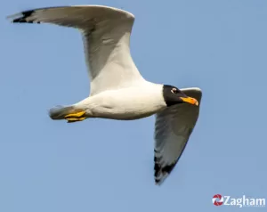 Pallas's Gull is a large gull with distinctive plumage. It has a white body, gray wings, and a black head with a broad white crescent around the eye. During breeding season, it develops a dark hood.
