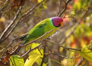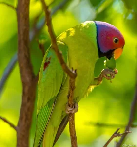 Plum-headed Parakeet (Psittacula cyanocephala) is a vibrant and striking bird species found in Pakistan. It is characterized by its predominantly green plumage, accented by a deep purple-blue head, which transitions into a rich crimson on the neck and upper breast. The males boast a distinctive black chin stripe and a red shoulder patch, while females exhibit a more subdued coloration with a pale blue head and lack the black chin stripe. These parakeets are medium-sized with a stout body, a long, tapering tail, and a curved beak adapted for feeding on seeds, fruits, and buds.