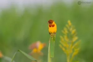 Red-headed Buntings are often solitary or found in small groups during non-breeding periods. They are known for their melodious songs, which they use for communication and attracting mates during the breeding season. These birds forage on the ground, feeding mainly on seeds, grains, and insects. Their behavior is generally secretive, often hiding in dense vegetation when not actively foraging or singing. During migration, they may form larger flocks, particularly near suitable stopover sites.
