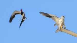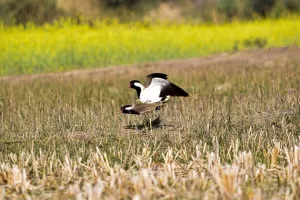 Behaviorally, the Red-wattled Lapwing is highly territorial and vocal, often emitting its loud “did-he-do-it” call, which serves as a warning to potential intruders. It is known for its distinctive habit of running rapidly along the ground, stopping abruptly to probe the soil for insects, small crustaceans, and other invertebrates, which form the bulk of its diet.