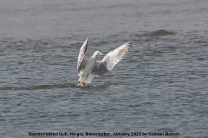 The Slender-billed Gull (Chroicocephalus genei) is a migratory bird species found in Pakistan. It is commonly spotted along the coastal areas of the country, particularly in Sindh and Balochistan provinces, during its winter migration period. This species prefers coastal habitats such as mudflats, estuaries, and lagoons.