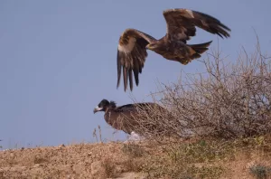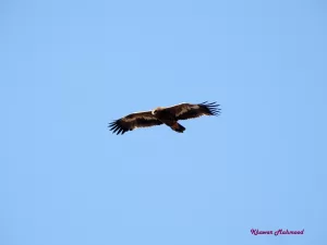 Steppe Eagle (Aquila nipalensis) exhibits distinct behavior reflective of its predatory nature and migratory habits. These majestic birds of prey primarily hunt small mammals, birds, and reptiles, often scanning the ground from elevated perches or soaring high in the sky. Steppe Eagles are known for their impressive aerial displays, utilizing thermal currents to effortlessly glide while searching for prey. During the breeding season, they establish nesting territories in open landscapes, constructing large stick nests in trees or on cliffs. Both parents participate in incubating the eggs and caring for the young. As migratory birds, Steppe Eagles undertake long-distance journeys between their breeding grounds in Central Asia and their wintering areas in South Asia, including Pakistan. Their migration routes often span vast distances, crossing multiple countries and ecosystems.