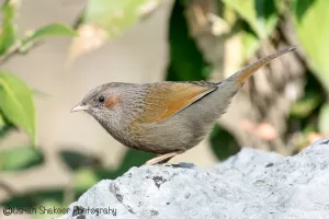 Small laughingthrush, streaky-brown and grey with dull rufous ear-coverts. Has fine dark streaking on crown and nape, and has greyish cast to crown and nape, rufous ear-coverts. Fine white streaking on mantle and underparts, and grey-tipped olive-brown tail with diffuse black subterminal band on outer feathers.
