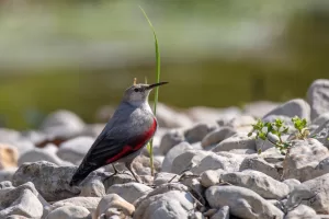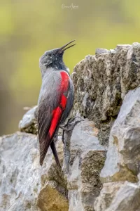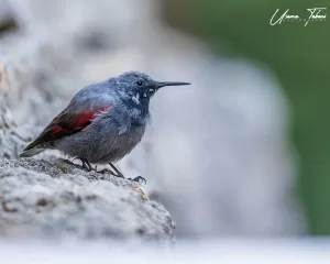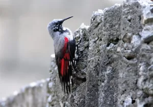 The Wallcreeper (Tichodroma muraria) is a small, colorful bird found in Pakistan. It has a unique appearance with striking crimson wings marked with black and white patterns. Its plumage blends well with rocky habitats, where it forages for insects and spiders. With its distinctive white wing bars and long, slender bill, the Wallcreeper is easily recognizable.