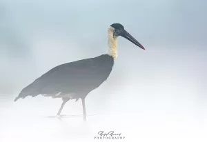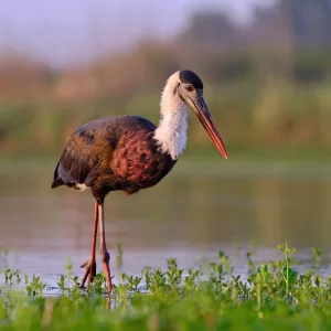 The Woolly-necked Stork is a large wading bird with a predominantly black and white plumage. It has a black head, neck, and back, contrasting with a white belly and underparts. The neck is adorned with a distinctive woolly white collar during the breeding season, giving the bird its name. Its bill is long, thick, and slightly curved, and its legs are long and pinkish in color. Juveniles have a more muted plumage and lack the woolly neck collar.