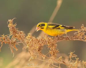 The Yellow-breasted Greenfinch (Chloris spinoides) is a small passerine bird native to Pakistan. It is characterized by its distinctive yellow breast, greenish upperparts, and conical bill. Males typically display brighter plumage than females.